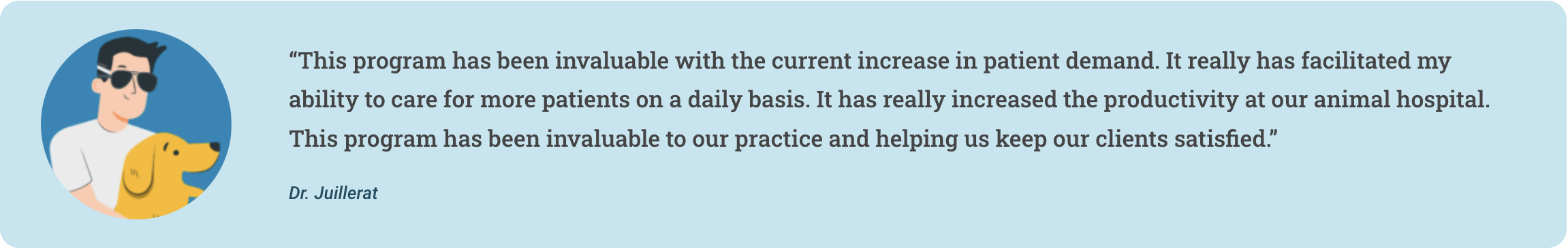 This program has been invaluable with the current increase in patient demand. It really has facilitated my ability to care for more patients on a daily basis. It has really increased the productivity at our animal hospital. This program has been invaluable to our practice and helping us keep our clients satisfied.”